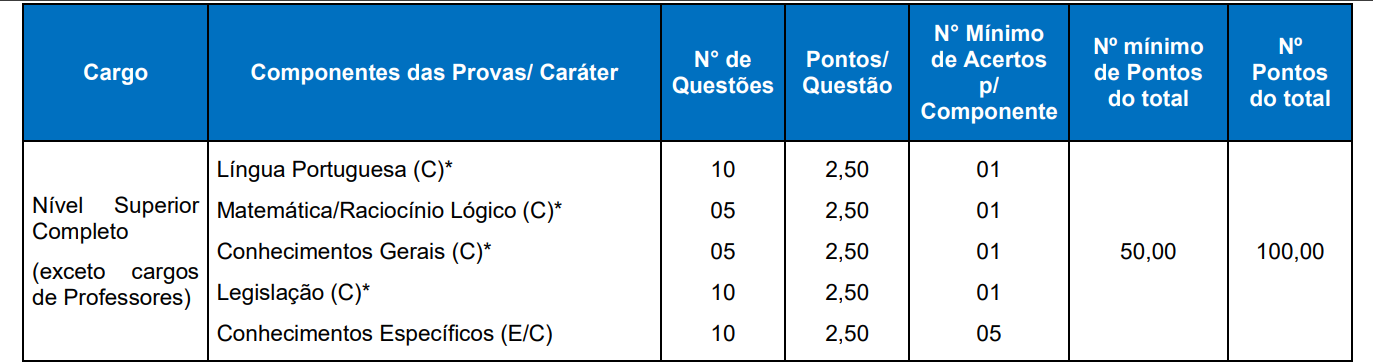 - Etapa Única: Prova Objetiva de múltipla escolha, de caráter eliminatório e classificatório, valendo 100 pontos;