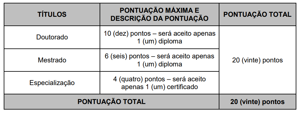 Os candidatos aprovados na Prova Objetiva concorrerão à Prova de Títulos, de caráter classificatório. A pontuação da Prova de Títulos não terá caráter eliminatório, sendo somada à nota obtida na prova objetiva para compor a classificação final do(a) candidato(a) e obedecerão à seguinte organização: