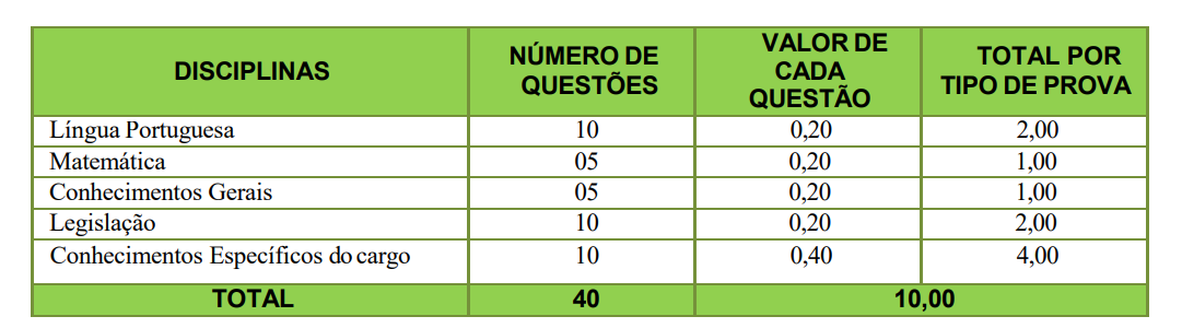 A Prova Objetiva será composta de 40 questões em formato de múltipla escolha, com 4 opções de resposta, sendo apenas 1 (uma) correta. Tem previsão para ocorrer no dia 04/01/2026. A prova terá duração de 03 horas e será composta pelas seguintes disciplinas: