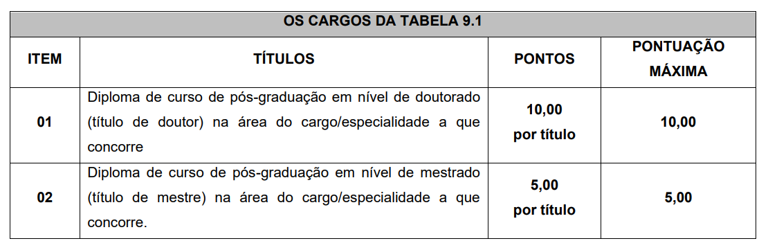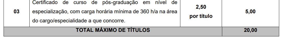 Os candidatos aprovados na Prova Objetiva concorrerão à Prova de Títulos, de caráter classificatório, valendo 20 pontos, que seguirá os seguintes critérios:
