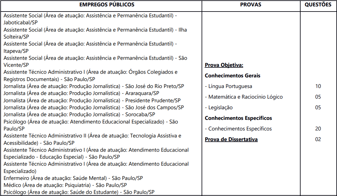 As provas serão aplicadas na cidade de Araraquara, Botucatu, Ilha solteira, Itapeva, Jaboticabal, Marília, Presidente, Prudente, São José do Rio Preto, São José dos Campos, São Paulo, São Vicente e Sorocaba.